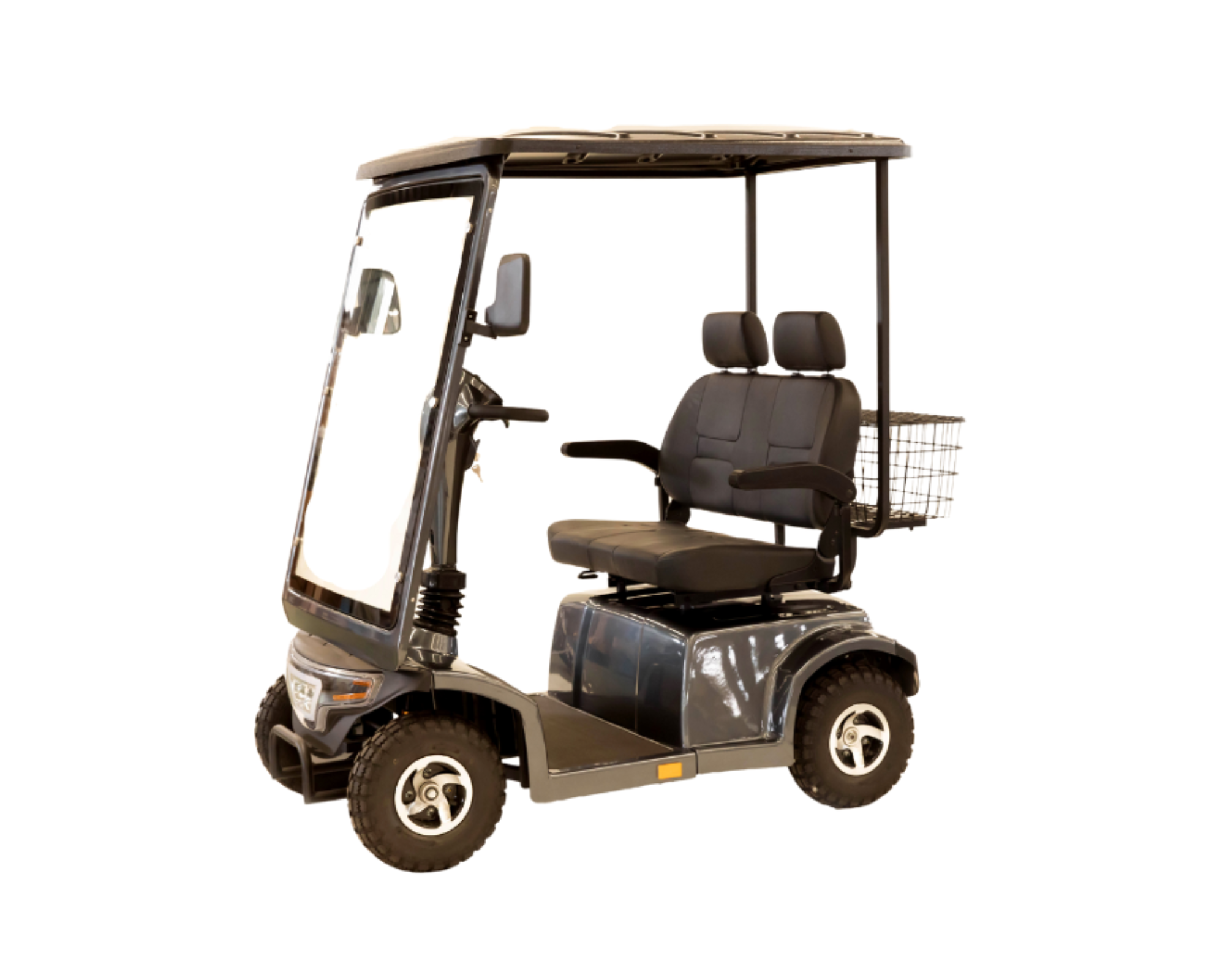 Large quality built double seat scooter with offset steering and hard canopy with tempered glass windscreen.